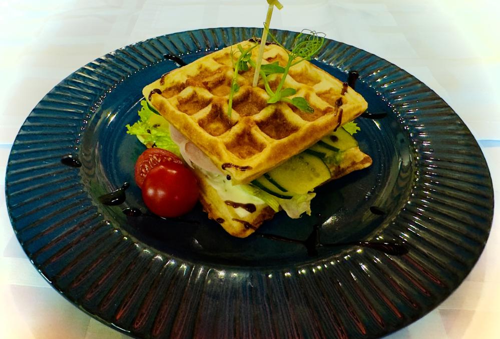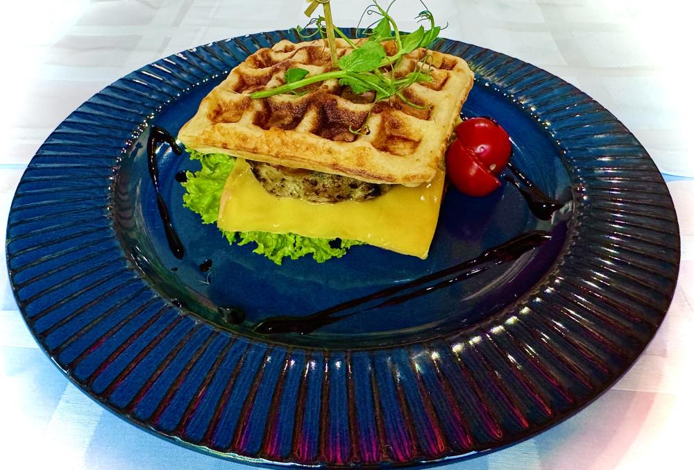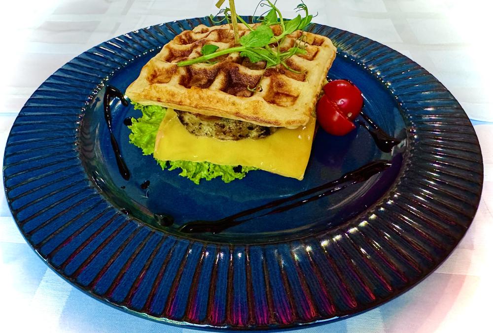 Вафли соленые, куриный бифштекс, сыр, салат, кетчуп, перец халапеньо.