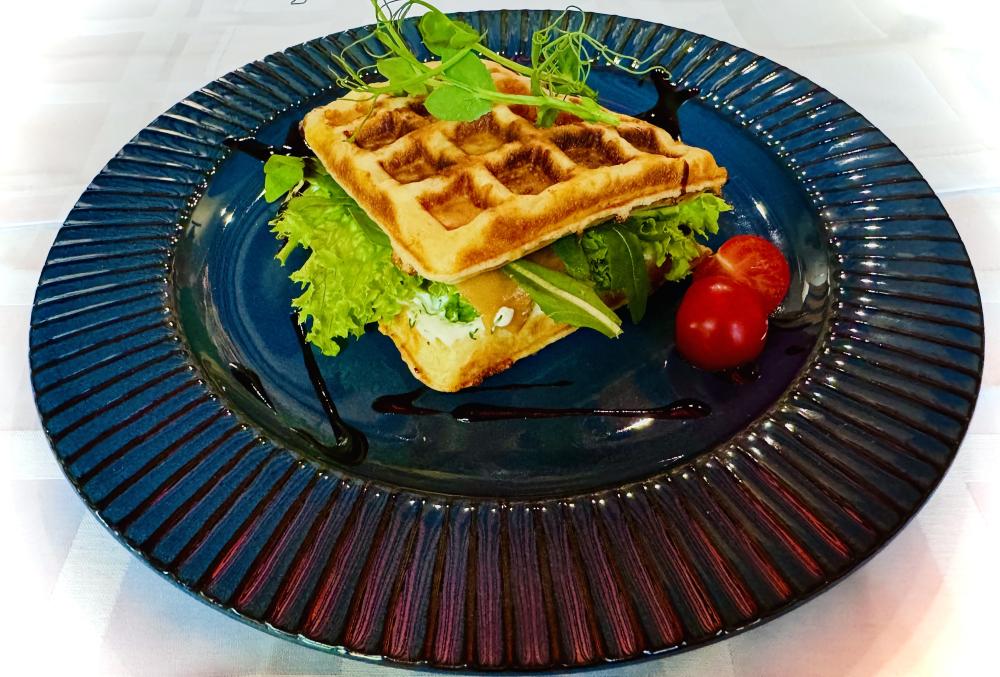 Вафли соленые, с/с лосось, творожный сыр, салат, руккола.
