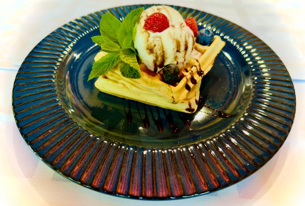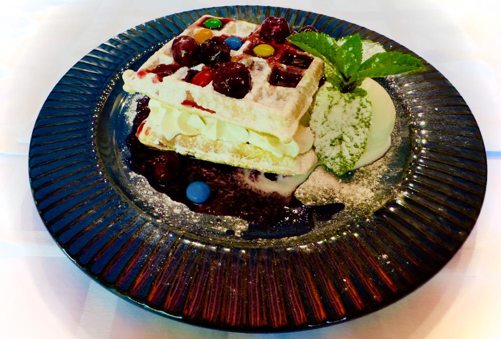 Сладкие вафли, крем заварной, ягоды, мороженое.