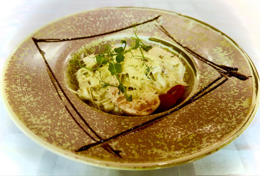 Фетучини, креветки, сливки, сыр пармезан.